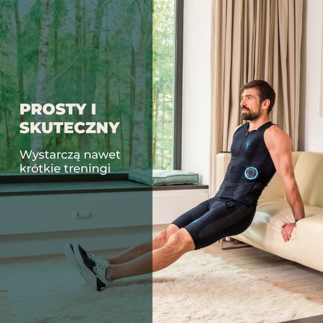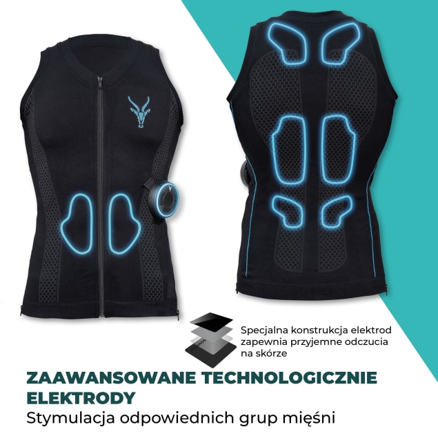 Koszulka EMS wzmacnia plecy, mięśnie głębokie i rdzeń, jednocześnie pozwalając na skuteczny trening mięśni brzucha i karku. Dzięki wszechstronnemu działaniu może być wykorzystywana w różnych formach aktywności fizycznej.